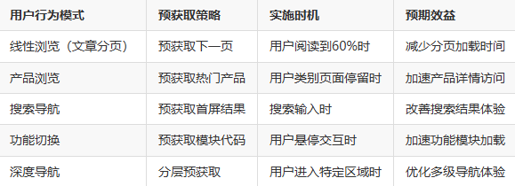 预获取最适合用于优化网站内导航体验,特别是对于用户很可能访问的下一页内容。常见应用场景包括:分页内容的下一页、产品详情页的主要产品、用户最可能点击的导航目标、单页应用的路由模块、搜索结果的第一页结果等。